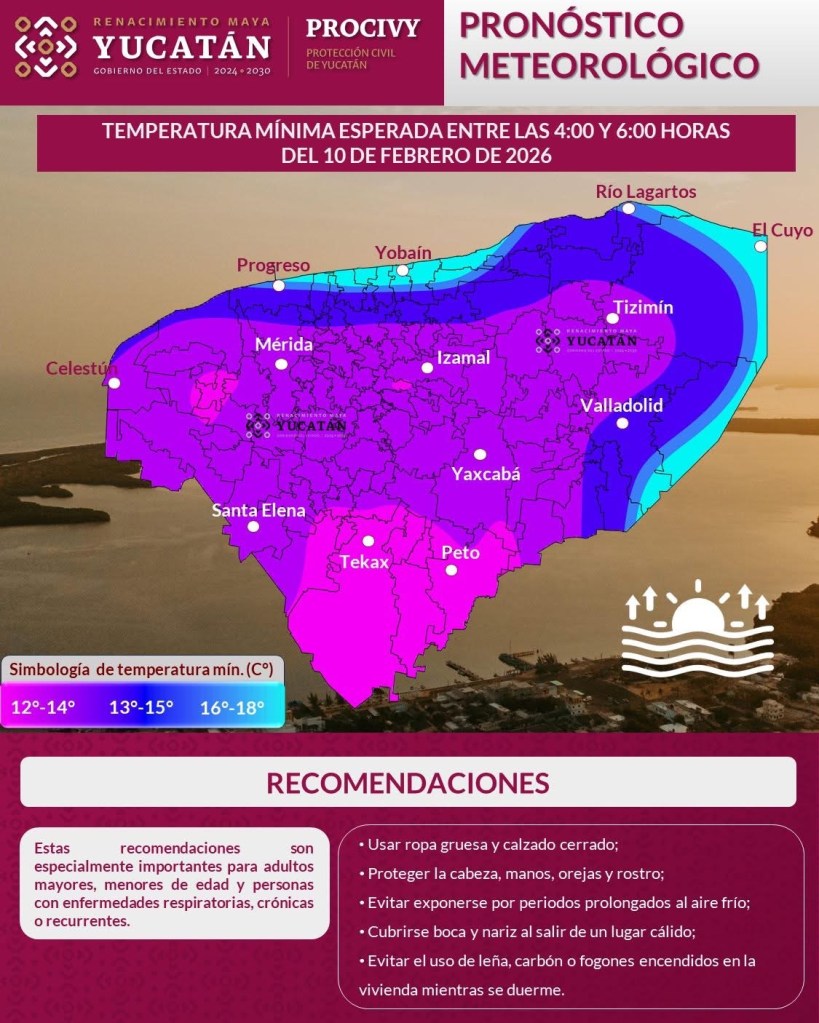 Para el amanecer de mañana martes 10 de febrero, se prevé un descenso en las temperaturas en gran parte del estado de Yucatán, de acuerdo con información emitida por Protección Civil.