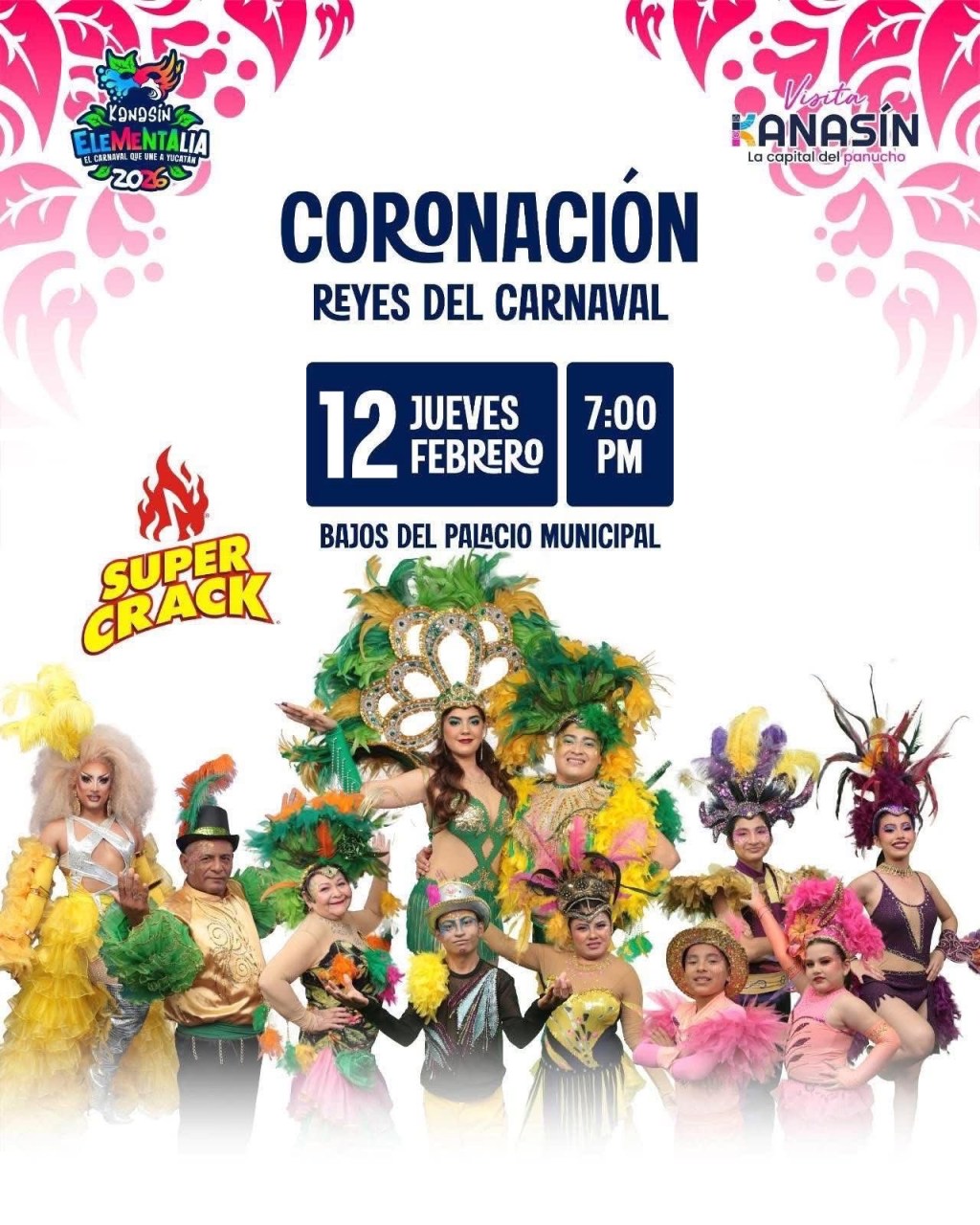 Para el jueves 12, a partir de las 7 de la noche, se realizará la coronación oficial de los Reyes del Carnaval 2026 en todas sus categorías, entre ellas juvenil, infantil, personas con discapacidad, adultos mayores y comunidad LGBT+, encabezadas por los reyes oficiales Nicte Ha I y Amauri I.
