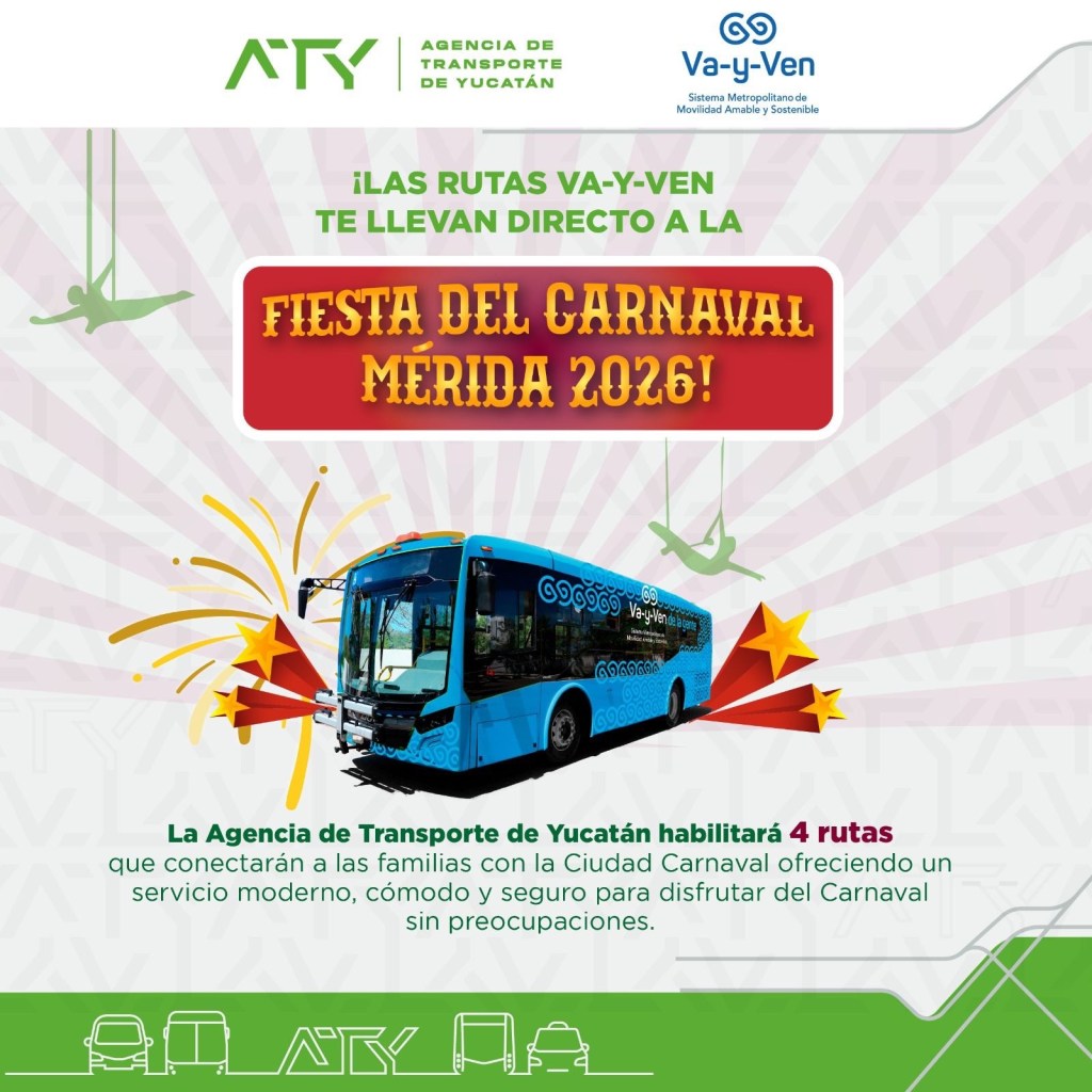 Para facilitar el acceso de las familias al Carnaval de Mérida 2026, la Agencia de Transporte de Yucatán (ATY) anunció un operativo especial con cuatro rutas del sistema Va y Ven que conectarán distintos puntos de la ciudad con Ciudad Carnaval, en Xmatkuil.