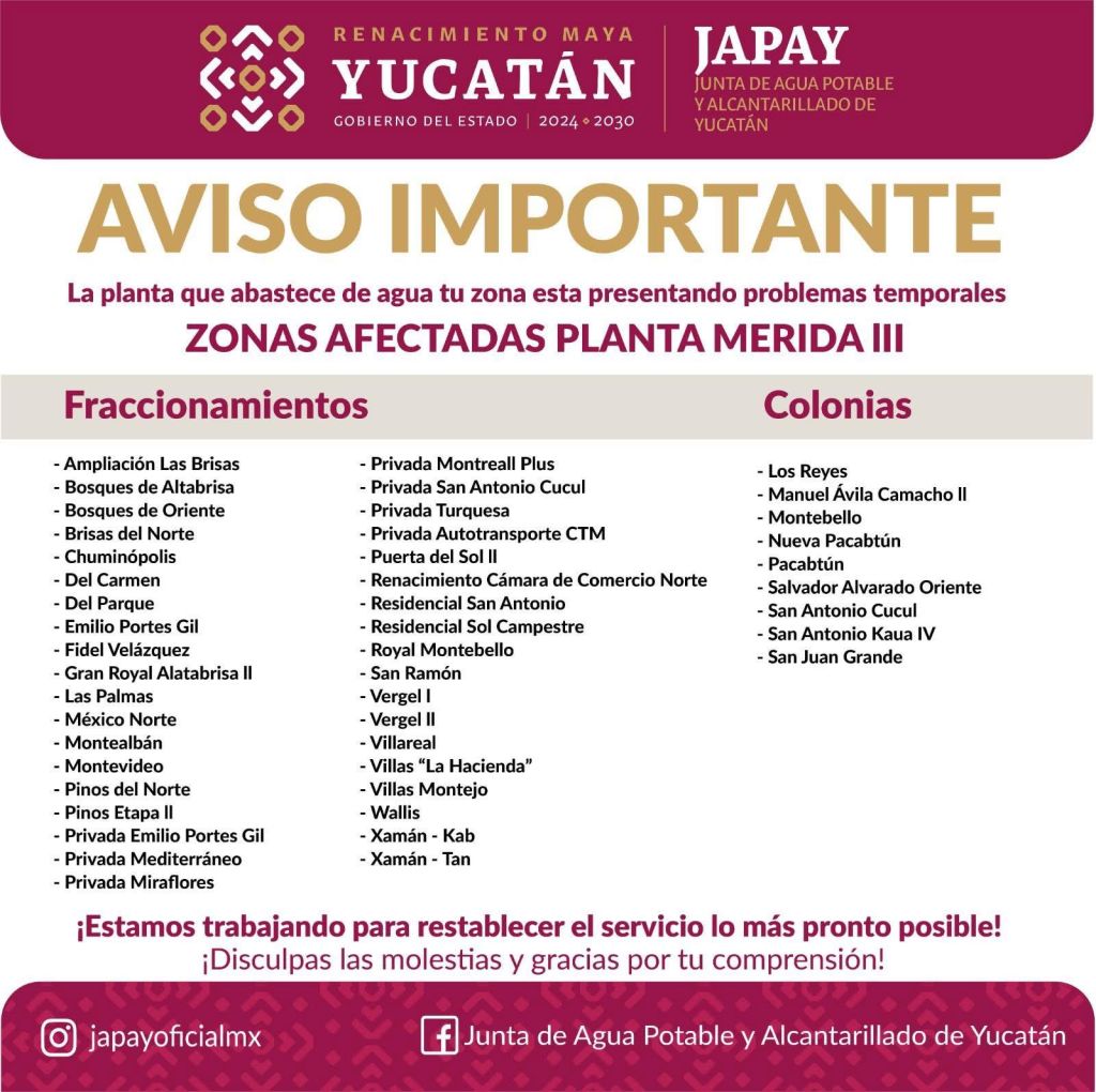 La Junta de Agua Potable y Alcantarillado de Yucatán (JAPAY) informó que la Planta Potabilizadora Mérida III presenta afectaciones temporales derivadas de trabajos de mantenimiento que realiza la Comisión Federal de Electricidad (CFE) en líneas de media tensión.