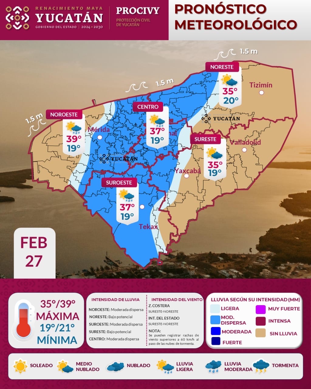 Para este viernes 27 de febrero, el ingreso de aire marítimo tropical procedente del Mar Caribe y el establecimiento de una vaguada favorecerán la presencia de lluvia moderada dispersa, acompañada de rachas de viento y posible actividad eléctrica, principalmente en el periodo de 16:00 a 20:00 horas, informó Protección Civil Yucatán.