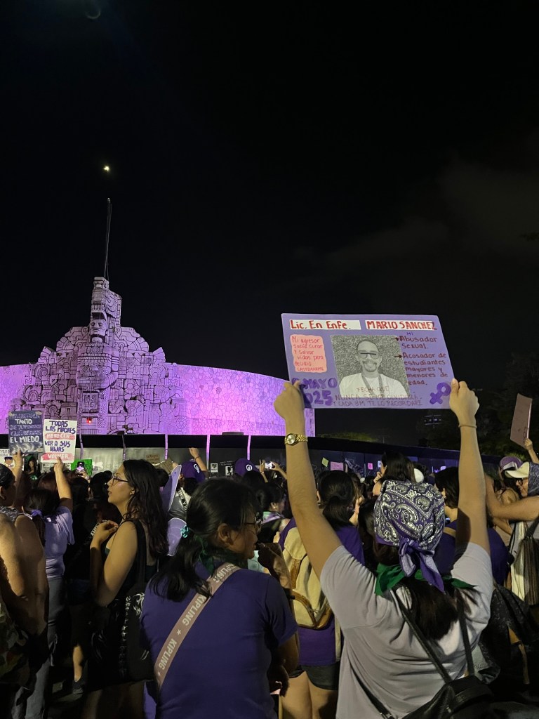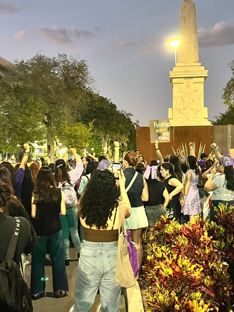 Finalmente, el recorrido culminó en el Monumento a la Patria, que se convirtió en el punto más intenso de la jornada. Aunque el sitio se encontraba protegido con vallas metálicas, un grupo de manifestantes del denominado bloque negro comenzó a retirar gradualmente la estructura hasta abrir un acceso que permitió que otras participantes ingresaran al área del monumento. Ese momento marcó el clímax de la movilización, entre consignas, aplausos y expresiones de protesta que resonaron en el emblemático espacio de Paseo de Montejo.